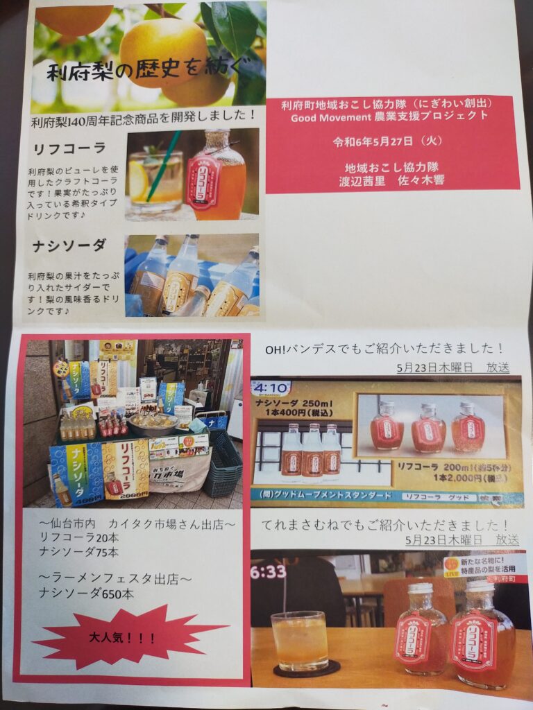 28日1000から議員全員協議会が開催され、6月定例会(6/11-14)に先立ち、当局が定例会に提出予定の議案等について説明がありました。また議会業務ではありませんが、冒頭、利府町地域おこし協力隊(にぎわい創出)Goodmovement農業支援プロジェクトの渡辺茜里さん、佐々木響さんから、利府梨を材料として製造した「ナシソーダ」と「リフコーラ」の紹介があり、ナシソーダを試飲させて頂きました。梨の香りが程よく残っていて柔らかな甘みがあり、美味しいソーダでした。ただ値段が400円/本とのことで、販路を拡大し単価を如何に下げるかが今後の課題のように思いました。ご馳走様でした。