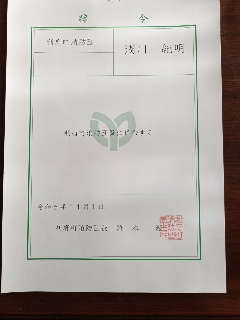 11月1日付で私は利府町消防団に入団しました。昨日(19日)に消防団の幹部会議があり、そこで正式に鈴木団長から辞令書を頂きました。